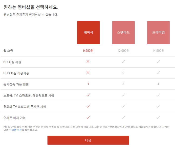 넷플릭스는 요금별로 서비스 내용이 다르니
